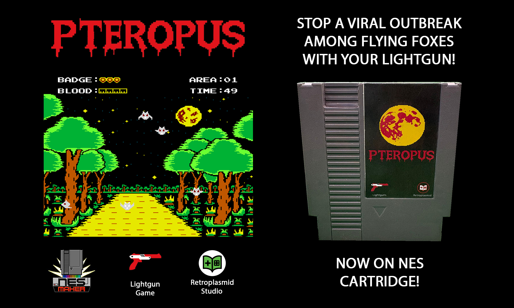 Pteropus is a retro-inspired gun shooting game designed for the Nintendo Entertainment System (NES) and it's zapper lightgun, similar to the classic Duck Hunt.